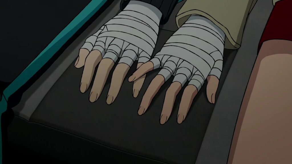 手をつないでいるシーンの後のちょっとしたディテールとして、モモのおばあちゃんがずっと鏡越しにふたりを見つめていたように見えることが挙げられます。ショットが彼女に切り替わると、鏡がモモとオカルンの間の空間をまっすぐに指し示しているのが分かります。