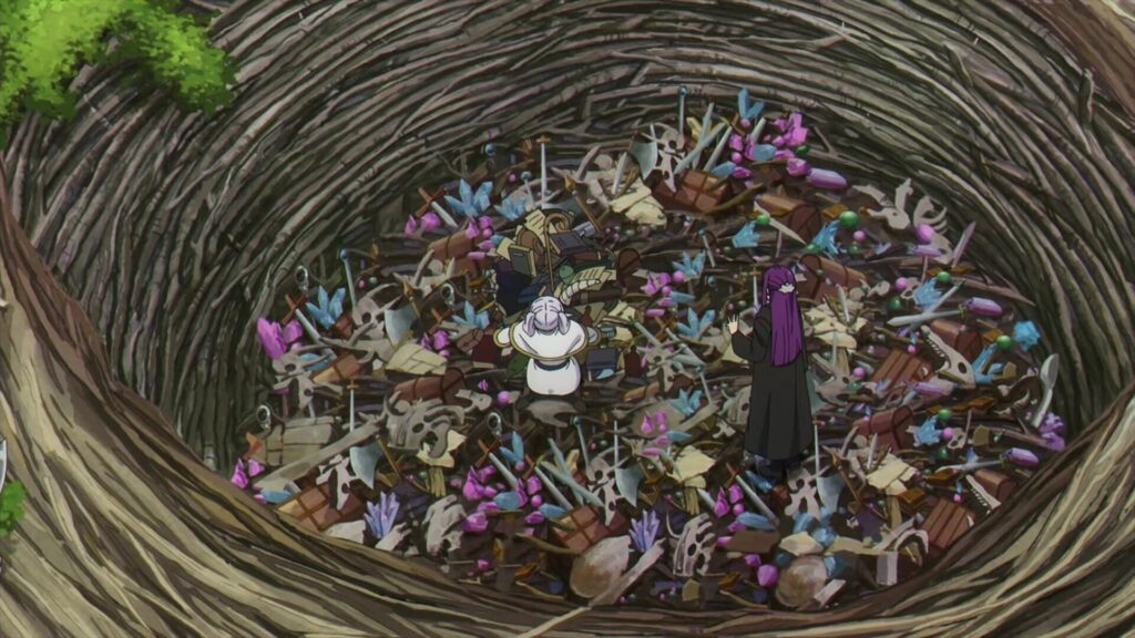 フリーレンはドラゴンの宝箱に、まるで新しいおもちゃを手に入れた子供のように大興奮。フェルンが「全部は持って帰れないから、3つまでにしておきなさい」と言うのが、すごく可愛くて面白い。まるで母子の仕草みたい。